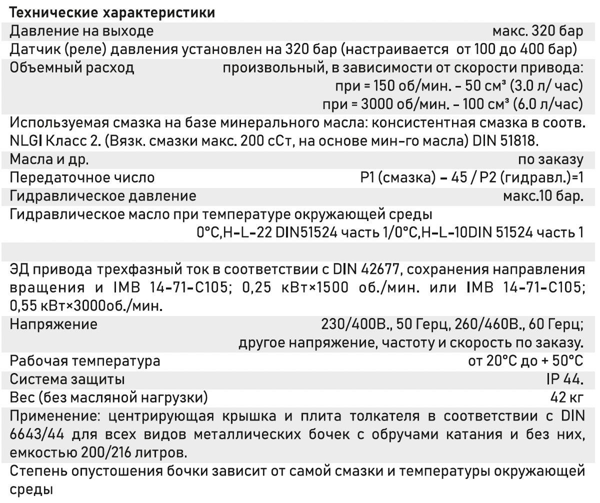 Вращение гидравлического мотора передаётся на поршень насоса смазки. При ходе поршня вверх консистентная смазка засасывается и подаётся в выпускной канал насоса. Максимально достижимое давление на выходе — 320 бар (т. е. гидравлическое давление, умноженное на внутреннее передаточное число).
