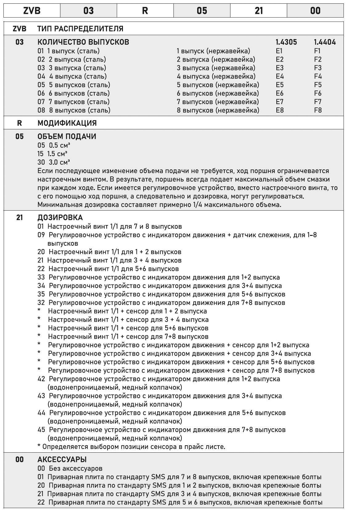 Конструкция Распределители ZV-B изготавливаются в блочной конструкции с различным дозируемым объемом. Каждый смазочный распределитель с обоих торцов имеет по два резьбовых отверстия G 3/8 для подключения на выбор двух главных магистралей. Для подключения линий точек трения распределитель имеет от двух до восьми резьбовых отверстий G 1/4. Распределитель не имеет пружин и работает на гидравлике, управляемый смазкой.