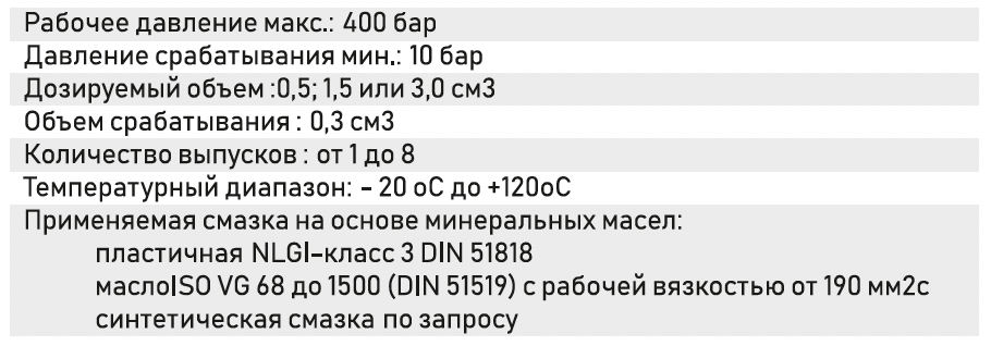 Особенности изделия • Двухлинейный моноблок • Масло и пластичная смазка • До 8 выпусков • Дозируемый объем 0,5; 1,5 или 3,0 см³ • Материал: литье методом непрерывной разливки или нержавеющая сталь
