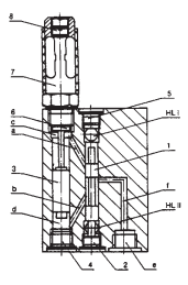 Принцип действия Давление в главной линии I (НL II) Если главная линия I (НL II) находится под давлением, то смазка переместит управляющий поршень (I) до упора (2). Смазка через канал (a) поступает в камеру (c) нажимая на дозирующий поршень (3), перемещая его до упора (4). Смазка, находящаяся в камере (d) перед торцом дозирующего поршня, выравнивается через каналы (b) и (f) к выпуску смазочной точки (e). Давление в главной линии II (НL III) Если главная линия II (НL III) находится под давлением, то смазка переместит управляющий поршень (I) до упора (5). Смазка через канал (b) поступает в камеру (d) нажимая на дозирующий поршень (3), перемещая его до упора (6). Смазка, находящаяся в камере (c) перед торцом дозирующего поршня, выравнивается через каналы (a) и (f) к выпуску смазочной точки (e). На дозирующемся поршне закреплен выдвижной штифт для визуального контроля работоспособности и одновременно возможности регулирования хода дозирующего поршня. Регулирование хода дозирующего поршня производится с помощью винта (8) и позволяет бесступенчато изменять поставляемую к выпуску дозу смазки. Штифт для визуального контроля и регулировочный винт совмещены в регулировочном устройстве (7).