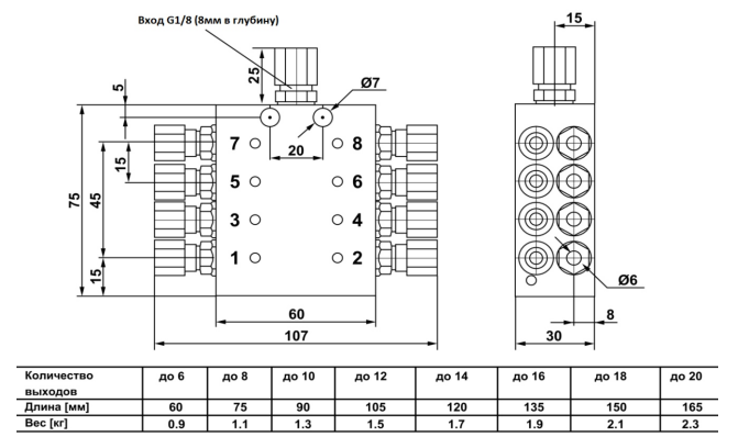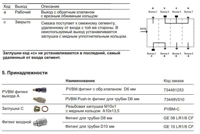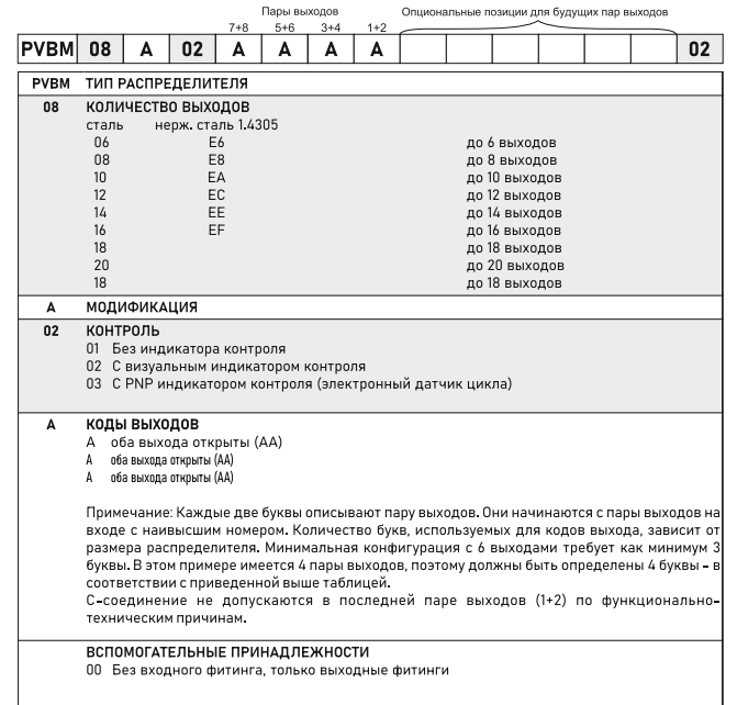 Распределители PVBM поставляются в 8 различных размерах (или 6 для версии из нержавеющей стали), в зависимости от количества требуемых выходов. Минимальная конфигурация состоит из 3-х золотников, имеющих до 6 выходов. Каждый дополнительный размер имеет дополнительный дозирующий поршень и дополнительную пару выходов. Для увеличения дозируемого объема, выходы распределителя могут быть объединены специальными заглушками.