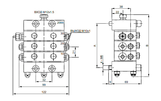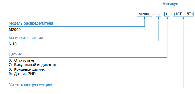 Правила заказа прогрессивных распределителей серий М2000 и М3000 Заказ комбинированного прогрессивного распределителя следует делать в соответствии с правилами заказа, но лучше предоставить схему комбинирования распределителя для большей ясности. Пример: заказ схемы распределителя 2000.
