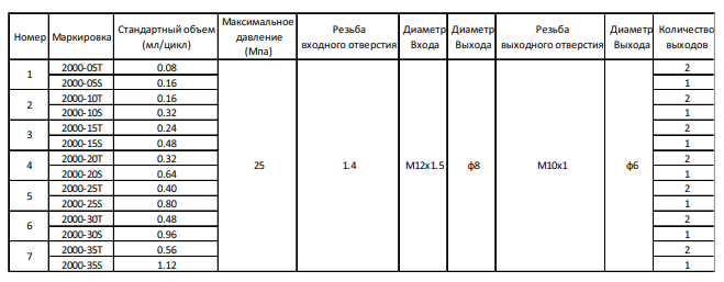 Серия прогрессивных распределителей 2000 является современным и рационально спроектированным решением дозирования смазок и масла. Распределители серии 2000 могут быть использованы в условиях с высоким давлением и в широком температурном диапазоне. Они могут образовывать небольшие системы смазки в сочетании с ручными, электрическими или пневматическими насосами. Это идеальный продукт для различных средних станков и оборудования, а также в качестве суб-распределителей в крупных системах смазки. Распределитель серии 2000 состоит из одной "IN - входной" секции, одной "END - концевой" секции и от 3 до 10 рабочих секций. Обычно один распределитель может обеспечить смазкой для 3 до 20 точек. Рабочие секции распределителей 2000 имеют различные исполнения по объемам (подробности см. в технических характеристиках). Рабочие секции с двумя выходными отверстиями (обозначаются буквой T после цифрового кода) имеют два выхода, расположенных на противоположных концах секции. Рабочие секции с одним выходным отверстием (обозначаются буквой S после цифрового кода) имеют один выход, который может находиться на любом из концов секции, в то время как другой выход необходимо закрыть. Важно отметить, что для рабочих секций с двумя выходами нельзя закрывать ни один из выходов, поскольку это повлияет на их нормальную работу и может повредить распределитель.