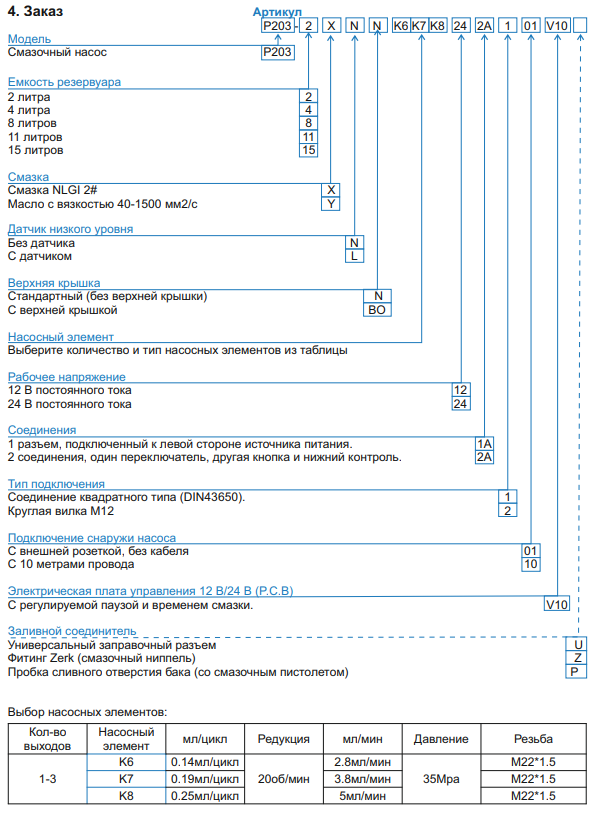 Смазочный насос P203 универсален, компактен и экономичен. Он может обеспечить до 150 точек смазки, в зависимости от длины линии. Насос состоит из корпуса со встроенным двигателем, резервуара с мешалкой, насосных элементов с встроенным клапаном сброса давления, заправочного ниппеля и разъемов для электрических соединений. Этот мощный насос может приводить в действие до трех насосных элементов и может быть оснащен датчиком нижнего уровня (с платой управления или без нее).
