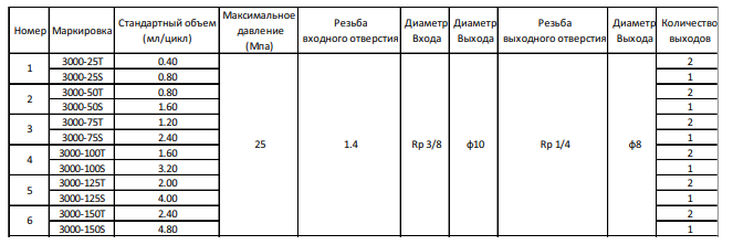 Серия распределителей масла M3000 является современным и рационально спроектированным распределителем масла. Распределители серии 3000 могут быть использованы в условиях с высоким давлением и широкими температурными изменениями. Они могут образовывать одиночные системы смазки в сочетании с электрическими и пневматическими насосами. Это идеальный продукт для различных крупных станков и портовых машин, а также для главных распределителей крупных одиночных систем смазки и аналогичных приложений. Обычная группа распределителей 3000 состоит из одной "головной пластины", одной "конечной пластины" и от 3 до 10 рабочих пластин. Обычно одна группа распределителей может обеспечить смазку для 3 до 20 точек смазки. Рабочие пластины распределителей 3000 имеют различные спецификации по объемам (подробности см. в технических спецификациях). Рабочие пластины с двумя выходными отверстиями (обозначаются буквой T после значения спецификации) имеют два выхода, расположенных на обоих концах пластины. Рабочие пластины с одним выходным отверстием (обозначаются буквой S после значения спецификации) имеют один выход, который может находиться на любом из концов пластины, в то время как другой выход необходимо закрыть. Важно отметить, что для рабочих пластин с двумя выходами нельзя закрывать ни один из выходов, поскольку это повлияет на их нормальную работу и может повредить распределитель.