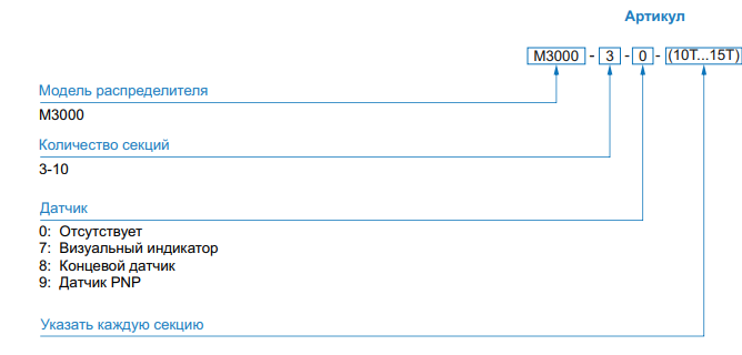 Правила заказа прогрессивных распределителей серий М2000 и М3000 Заказ комбинированного прогрессивного распределителя следует делать в соответствии с правилами заказа, но лучше предоставить схему комбинирования распределителя для большей ясности. Пример: заказ схемы распределителя 2000.